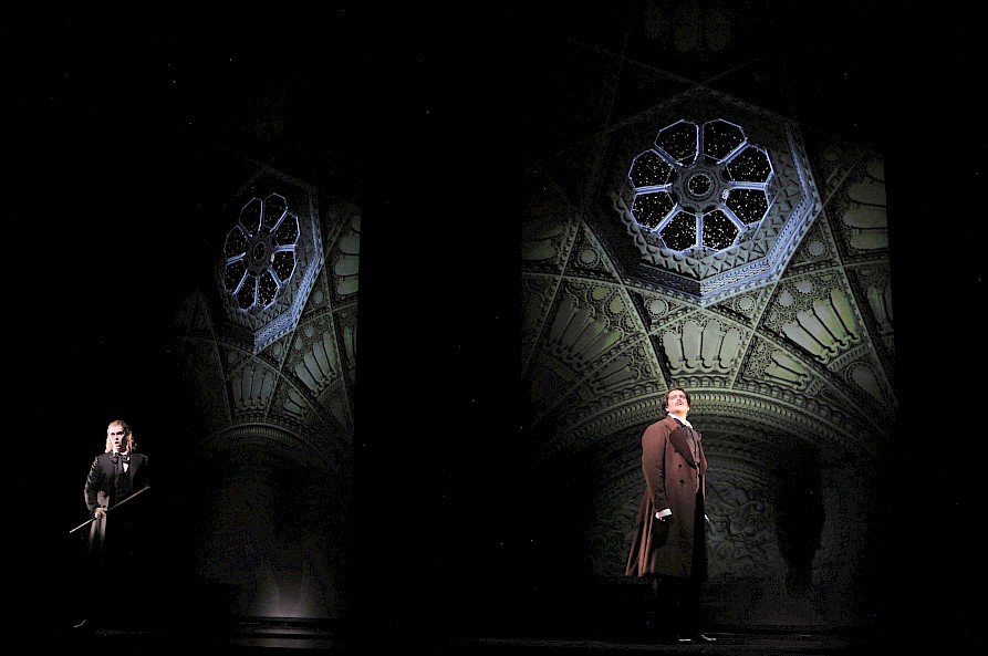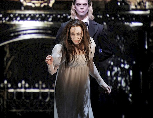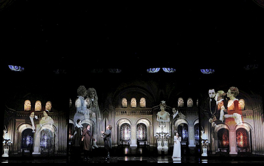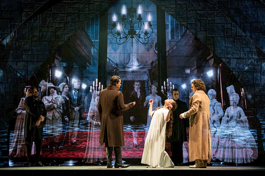 In addition, Getty…has added elements to the devolution of the ancient curse on the Usher family, and has chosen to put the Usher Ancestors into the production (as either silent performers or projections). These alterations heighten the dramatic impact of the show, effectively conveyed in this recording by the emotive and powerful voices of the small international cast…