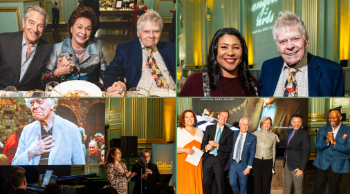 On March 7, 2024, Festival Napa Valley presented composer Gordon Getty with the Angels of the Arts award, its highest honor, celebrating outstanding contributions to the arts. The gala event took place at San Francisco’s War Memorial Green Room, with a dinner prepared by Sarah and Evan Rich, paired with select wines from Festival Napa Valley partner wineries. Alexandra Armantrading, David Barnett, Curt Branom, Lisa Delan, Nathan Granner, Jake Heggie, Lester Lynch, Kevin Korth and Frederica von Stade offered performances of some of Getty’s favorite songs. He was toasted by fellow vintners Michelle and Robin Baggett, and Darioush Kahledi, and he received tributes from California Governor Gavin Newsom, Speaker Emeritus Nancy Pelosi, San Francisco Mayor London Breed, composer John Corigliano, mezzo-soprano Joyce DiDonato, and Francisco J. Núñez and the Young People’s Chorus of New York City. Rick Walker, President/CEO of Festival Napa Valley, made the award presentation. As a finale, Lisa Delan read her poem entitled “December 20, 1933” (Getty’s birth date), a tribute commissioned by Festival Napa Valley for the occasion, and all the singers joined Jake Heggie at the piano for a rousing performance of “For Gordon” set to “Mame” with words by Curt Branom.