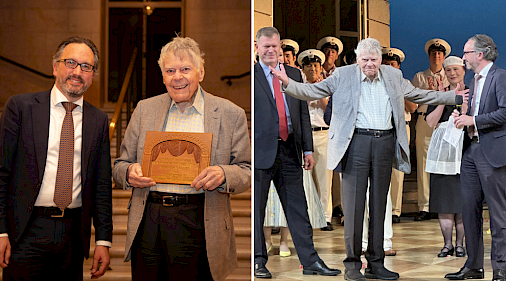 At the conclusion of San Francisco Opera’s December 9 fall season final performance of The Elixir of Love, the company honored composer and philanthropist Gordon Getty in an onstage ceremony. Standing amidst the cast of Donizetti’s opera, San Francisco Opera General Director Matthew Shilvock presented Mr. Getty with the company’s Spirit of the Opera award in recognition of extraordinary artistic excellence and philanthropic leadership.